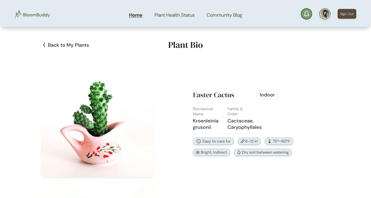 BloomBuddy is a plant care application concept designed as part of an HCI prototyping and usability course. Completed in a team of five, the project explored how digital tools could help novice plant owners better understand plant health, stay consistent with care routines, and feel more confident managing their plants across mobile and desktop experiences.