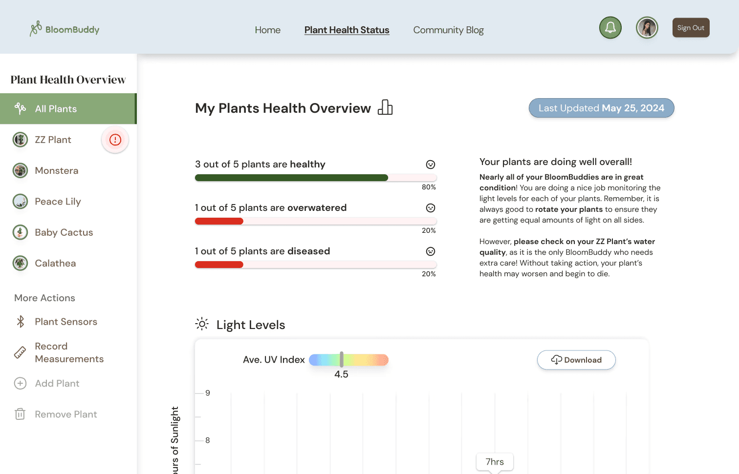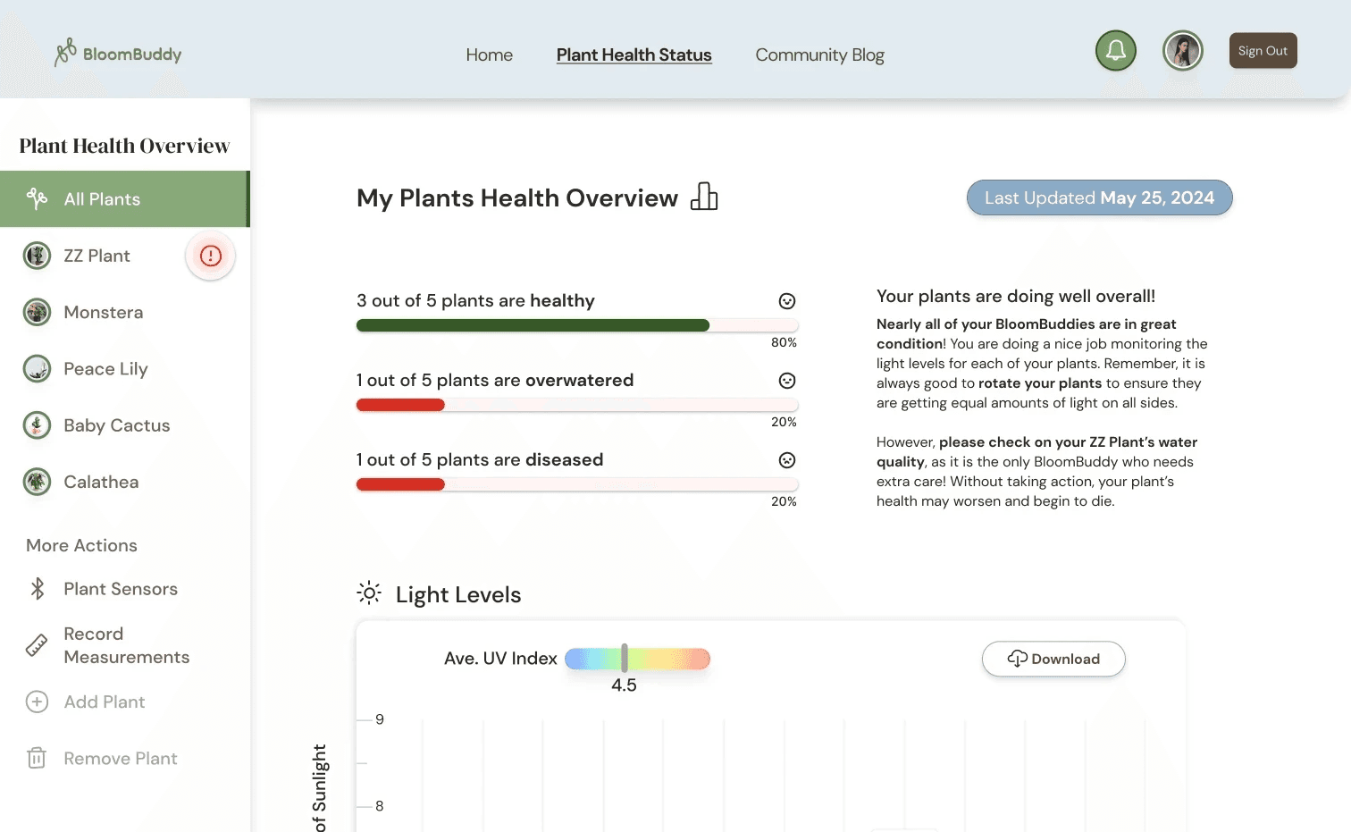 Clear dashboards and health indicators help users understand plant needs at a glance.